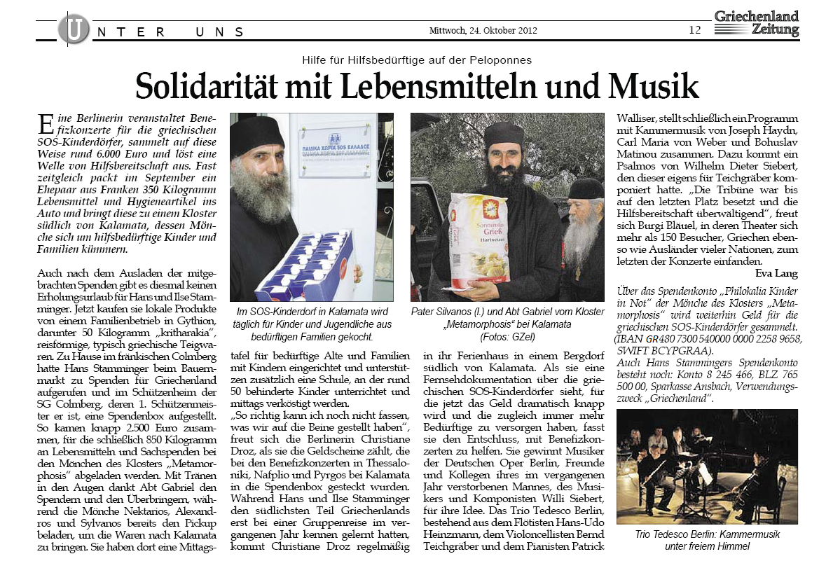 deren Erlös hauptsächlich der Sonderschule und dem Ambulatorium in Kalamata zugute kommt. Auch ein Altenheim in Gythion wird Woche