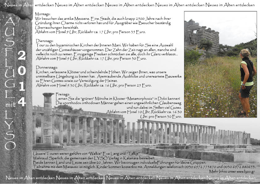Auch im Jahr 2014 bietet der LYSO-Verlag Kalamata neben Lesegenuss wieder Tagestouren und Ausflüge zu antiken Stätten und zu urgriechischen Themen an.
